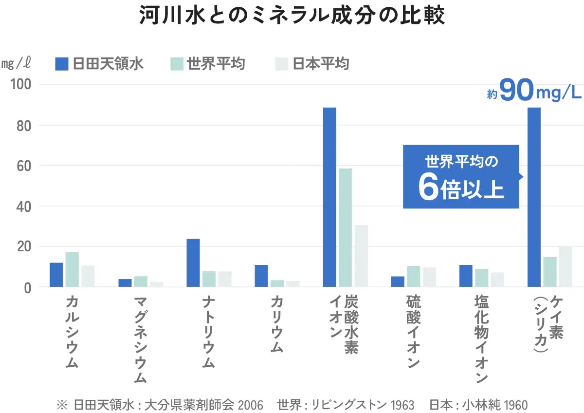 日田天領水には体内で生成できない、美のミネラルである天然シリカを1リットル中に約90mgも含有。