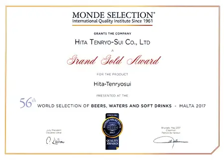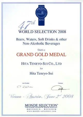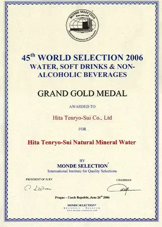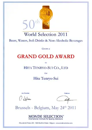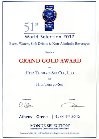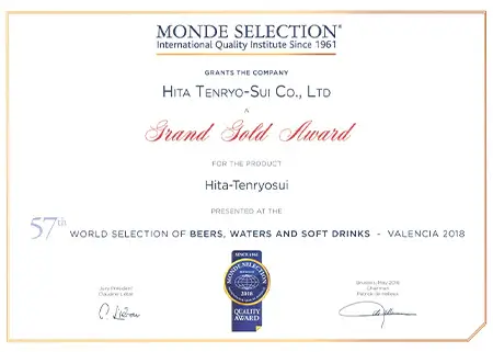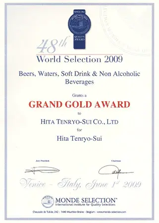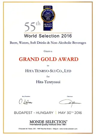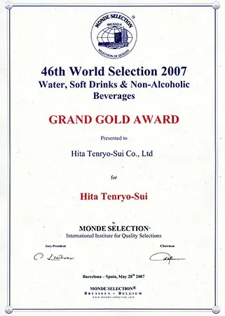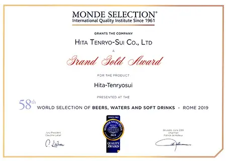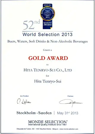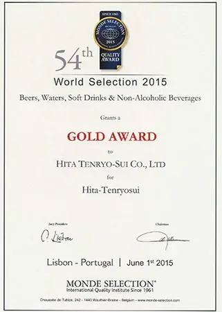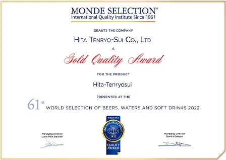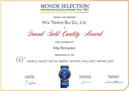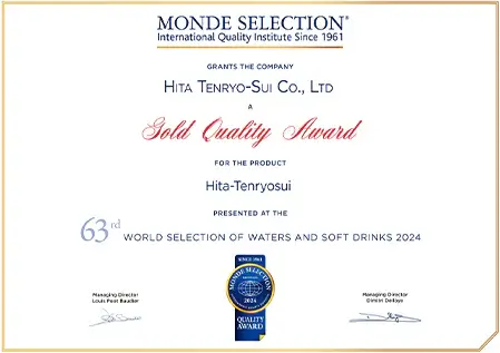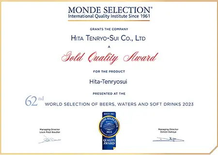 認定は大変な栄誉であり、日田天領水は2005年から2009年に二ツ星、2010年以降は毎年「Superior Taste Award(三ツ星)」を受賞し、20年連続で表彰されています。