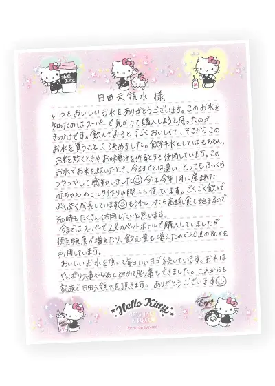 日田天領水は1999年の発売以来たくさんの方々にご愛顧いただき、皆様から毎日のようにお手紙をお寄せいただいております。