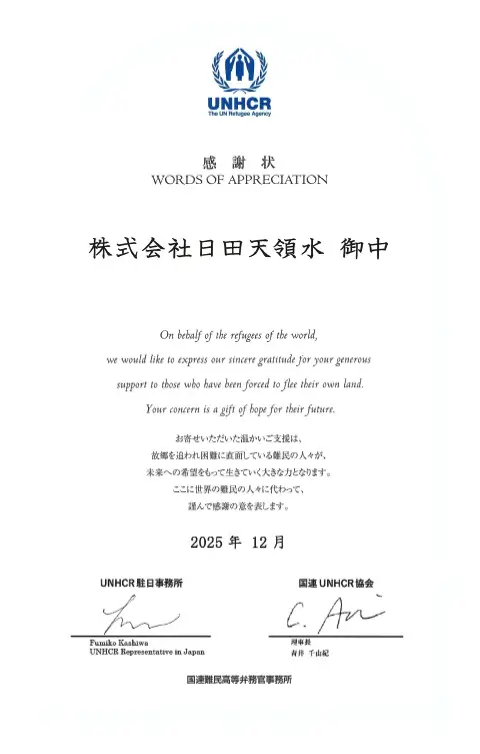日田天領水は、企業の社会的責任として、製品の売り上げの一部をUNHCRに寄付しています。