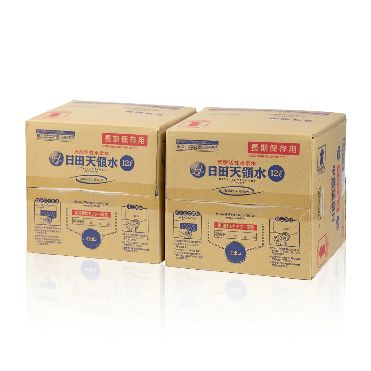 日田天領水の長期保存用は12L×2個組セット・2L×6本入×2箱・2L×10本入の三種類ございます。 4人家族で飲料用として3日分で最低24L必要と言われています。いざというときのために備えておくことが重要です。