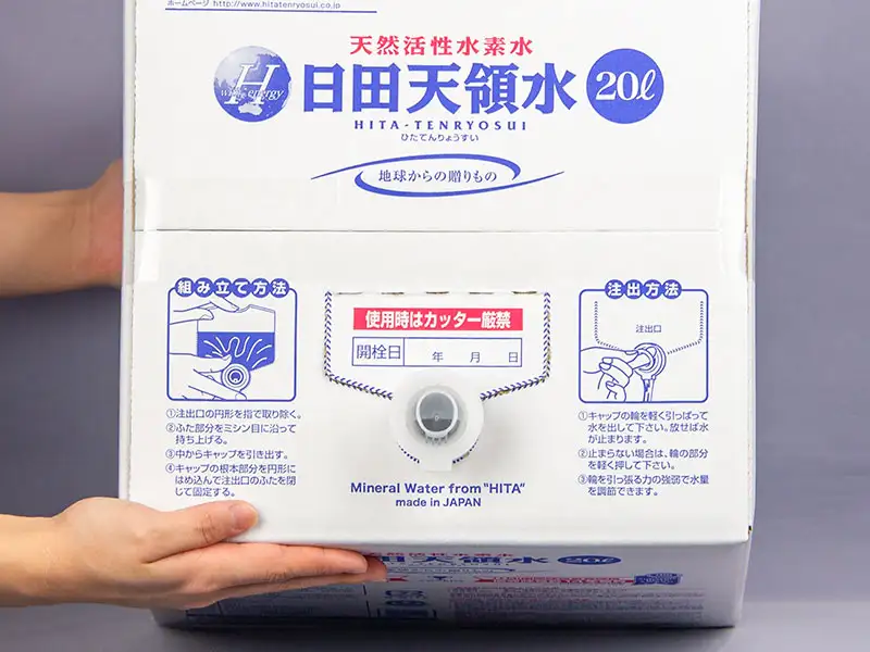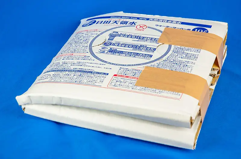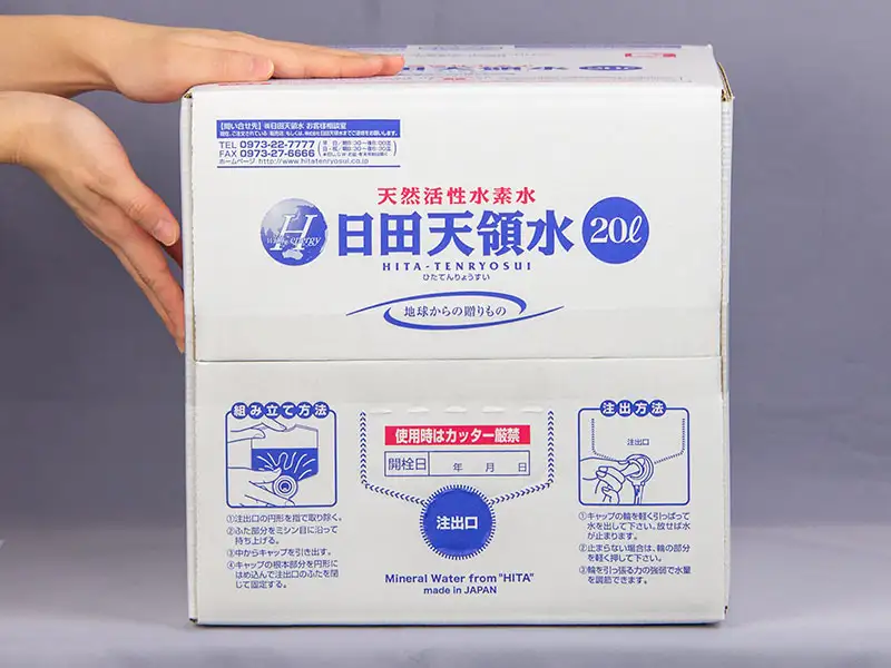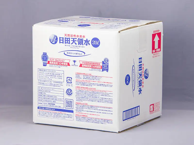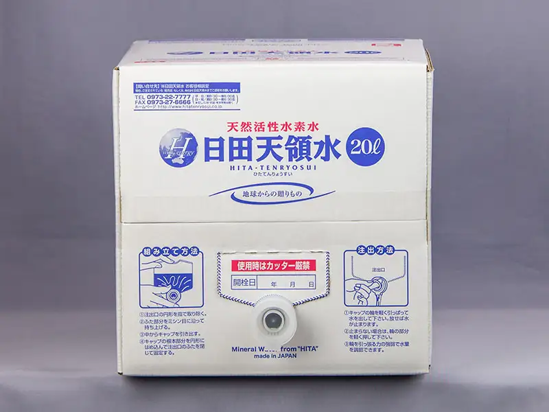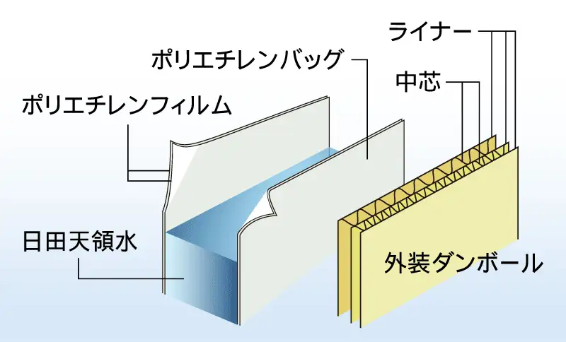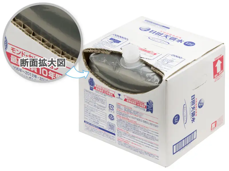 日田天領水のBIBは新鮮なお水を届ける為にさまざまな工夫がされています。内装はポリエチレンバック、外装は丈夫な段ボール製で、容器の回収が不要の安全・エコな設計になっています。
