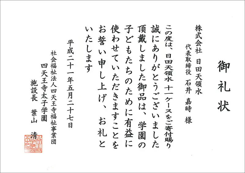 平成21年5月には、大阪府と兵庫県の新型インフルエンザに罹患した患者様に日田天領水20リットル10,000ケースを無償進呈いたしました。